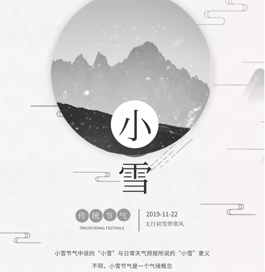 小雪,24節(jié)氣中的第20個(gè)節(jié)氣,在公歷11月22日至23日入節(jié),時(shí)太陽到達(dá)黃經(jīng)240°。小雪和雨水、谷雨等一樣,都是直接反映降水的節(jié)氣。小雪表示降雪的開始,天氣轉(zhuǎn)變,由冷轉(zhuǎn)寒,也應(yīng)做好身體的防護(hù)。