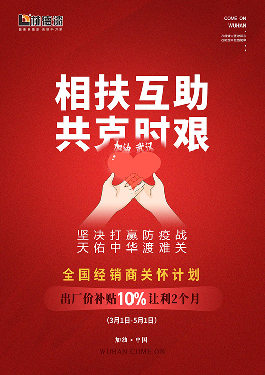 歲寒知松柏,患難見真情。在這艱難時刻,林德漆愿成為經(jīng)銷商伙伴們的堅實后盾,出臺多項有力政策與舉措,助力經(jīng)銷商伙伴們攻堅戰(zhàn)役。在此,林德漆決定與全國經(jīng)銷商相扶互助、共克時艱,于3月1日開啟“全國經(jīng)銷商關(guān)懷計劃”。長達2個月的讓利補貼,助力全國經(jīng)銷商渡過難關(guān),跑贏市場。