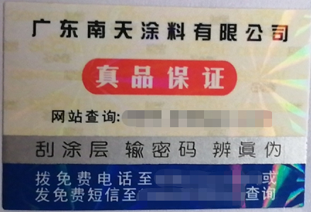 在鑒別假冒偽劣產(chǎn)品上,南天涂料的每桶產(chǎn)品都有對(duì)應(yīng)的防偽標(biāo)簽,桶身有二維碼掃描確認(rèn),其次可以進(jìn)入南天涂料官網(wǎng)在線查詢或是撥打南天涂料公司服務(wù)電話查詢。