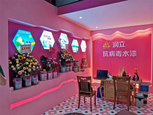 門店內(nèi)的整體設(shè)計(jì)簡潔,給人一種明亮大氣的感覺,潤立漆LOGO放在背景墻的中間位置,背景墻統(tǒng)一涂刷成大膽喜慶的玫紅色,寓意潤立漆生意紅紅火火。從店面布局來看,它一改傳統(tǒng)涂料專賣店密密麻麻擺滿涂料產(chǎn)品的布局,兩端為產(chǎn)品陳設(shè)區(qū),中間為簡潔空敞的洽談區(qū),給客戶帶來耳目一新的感覺。每一個(gè)木樁上安置一桶抗病毒涂料,表達(dá)了潤立漆追求健康、環(huán)保、天然的理念。