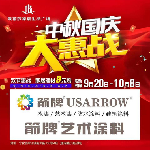 2020年9月20日-10月8日,即中秋國慶雙節(jié)假期前后,福建寧化的著名建材家居銷售點——歐蓓莎家居生活廣場特別聯(lián)合各大商家舉辦了一場福利滿滿、豪禮不斷的大惠戰(zhàn)活動,為寧化老百姓獻上珍貴的雙節(jié)賀禮!而箭牌漆福建寧化專賣店亦加入到了這場鉅惠盛宴中,滿懷誠意地為寧化消費者帶來超值的涂料消費體驗。