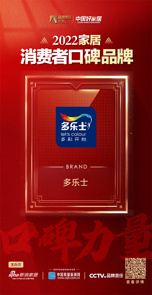 近日,在新浪家居攜手中國質(zhì)量新聞網(wǎng)、中央電視臺《品牌責(zé)任》欄目主辦的《中國好家居——2022中國家居消費者口碑調(diào)查》活動結(jié)果發(fā)布中,多樂士憑借多年來的優(yōu)良口碑,獲登2022消費者口碑品牌榜,成為最受消費者認可與信賴的涂料品牌。