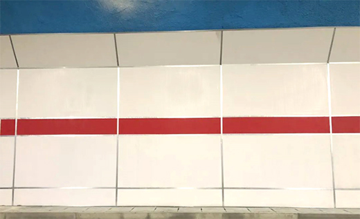 長沙麓景路南延工程隧道項目中兩側(cè)墻面應用的新型材料為美涂士明星產(chǎn)品:隧道防火裝飾板,施工總面積達60000㎡,該隧道防火裝飾板具有抗菌、防腐、抗酸堿、抗老化等性能,和隧道環(huán)境是非常匹配的,其性能和氣候、環(huán)境的匹配也能大大延長其使用壽命。除此之外,隧道防火裝飾板整體是用了上下銀灰色平鋪、中間紅色線條點綴的設(shè)計風格,搭配隧道藍天白云噴漆的拱形頂,在顏值和美觀度上顯得時尚、清爽、大氣,相信駕駛經(jīng)過隧道內(nèi)部,也是一番別樣的感受。
