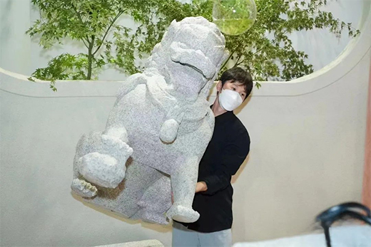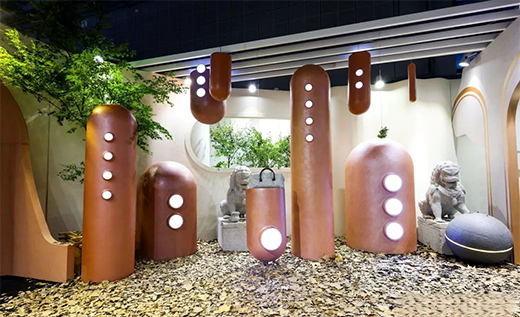 這首先體現(xiàn)在作為此次展覽主要組成部分的神奇空間區(qū)。該區(qū)域大量使用視錯(cuò)覺的體驗(yàn),布置了很多像石頭一樣的形狀物。這些“石頭”其實(shí)是結(jié)合臻輔材別墅之星EPS構(gòu)件,運(yùn)用質(zhì)感外墻的仿石涂料制作出頗具趣味性的裝置,如能隨手拎起的“石頭”包,僅憑一人就可輕松抱起的“石獅子”等。