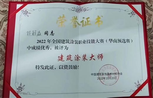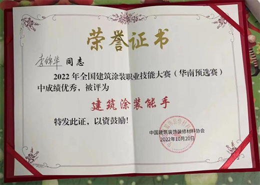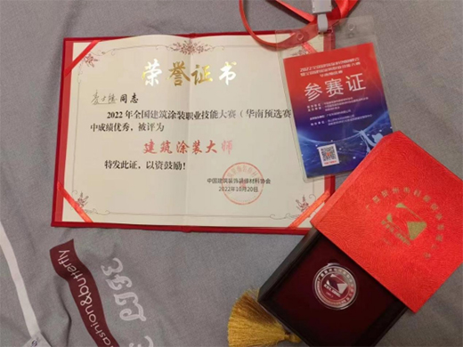 本次大賽中,林德漆參賽選手李錦華、麥土德、陳穎磊憑借扎實的專業(yè)理論功底,以及優(yōu)異的實操成績,在激烈的競爭中脫穎而出,分別榮獲“建筑涂裝能手”、“建筑涂裝大師”的稱號。