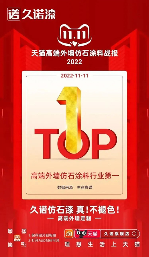 久諾的“栽樹”行為還包括打通線上網(wǎng)絡(luò)平臺(tái),深入展開企業(yè)數(shù)字化升級(jí)完善,提升客戶體驗(yàn),強(qiáng)化品牌勢(shì)能。在今年天貓雙11狂歡購(gòu)物節(jié)上,久諾品牌的新零售業(yè)績(jī)被一再刷新。首度征戰(zhàn)天貓零售商城,榮登天貓雙十一行業(yè)會(huì)場(chǎng)大牌PK榜,與林氏木業(yè)、金牌櫥柜、東鵬瓷磚等家裝建材行業(yè)實(shí)力品牌同臺(tái)PK,盡顯實(shí)力。這場(chǎng)狂歡久諾仿石漆實(shí)現(xiàn)全網(wǎng)銷售突破150000㎡,成為天貓高端外墻仿石涂料行業(yè)第一。