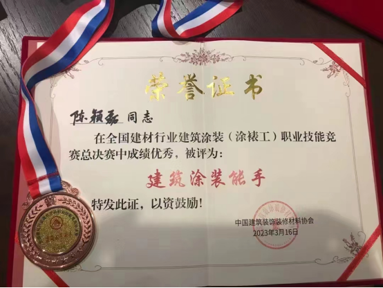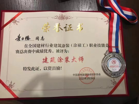 最終,經(jīng)過兩天的激烈角逐,林德漆麥土德和陳穎磊兩位選手憑借精湛的技術(shù),分別榮獲全國建材行業(yè)建筑涂裝職業(yè)技能競賽總決賽“建筑涂裝大師”獎(jiǎng)和“建筑涂裝能手”獎(jiǎng)。