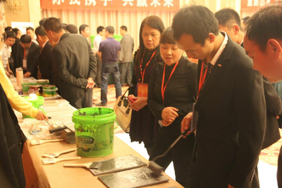 隨后,工程運用部部長黃新生發(fā)表了以《工程漆產(chǎn)品推廣》為主旨的演講。他詳細講解了巖片漆、多彩漆、砂膠漆、真石漆的產(chǎn)品優(yōu)勢及涂裝效果,并獲得了一致好評,與會經(jīng)銷商都表示很看好工程漆產(chǎn)品的后期市場。