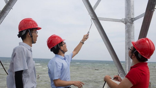 9月13日,中科院寧波材料技術與工程研究所王立平研究員(中)和科研人員劉栓(右)、盧光明在檢查一處海氣通量塔防腐示范工程。中國科學院寧波材料技術與工程研究所王立平研究員和薛群基院士團隊經過數年技術攻關,成功突破石墨烯改性防腐涂料研發(fā)及應用的技術瓶頸,開發(fā)出擁有自主知識產權的新型石墨烯改性重防腐涂料。目前該成果通過中國腐蝕與防護學會鑒定,關鍵技術指標鹽霧壽命超過6000小時,處于國際領先水平,并成功應用于國家電網、石油化工、海洋工程與裝備等領域。