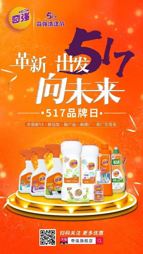 奇強(qiáng)“517洗滌節(jié)”不僅僅是產(chǎn)品與品牌的革新,更是“傳承自然資源,革新綠色技術(shù)”的一次企業(yè)理念革新,勢必引領(lǐng)日化行業(yè)的一次全新風(fēng)尚。奇強(qiáng)“517洗滌節(jié)”將以“革新、出發(fā)、向未來”為主題,使該節(jié)日逐漸成為奇強(qiáng)品牌及全民的超級符號。