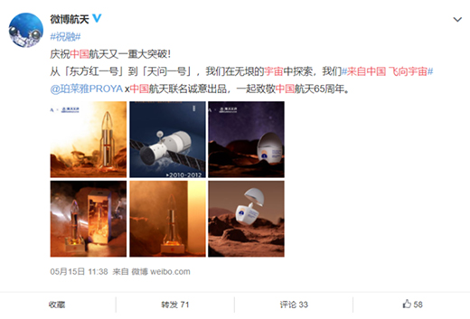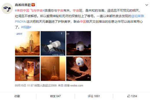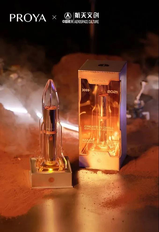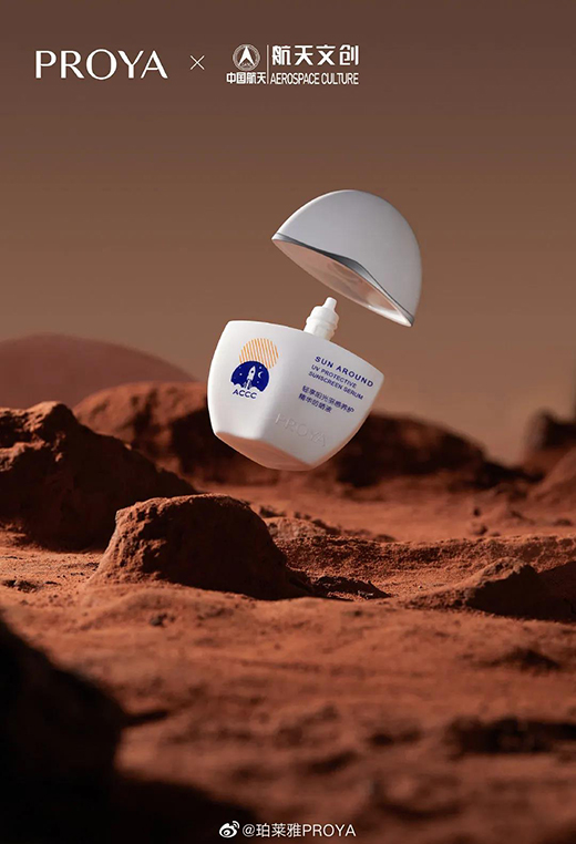 值“天問一號”著陸之際,中國美妝品牌珀萊雅正式宣布與中國航天跨界聯(lián)名,發(fā)布長圖回顧中國航天65年輝煌歷程,同時推出“雙抗精華中國航天珍藏款”與“羽感防曬中國航天定制款”產品,致敬中國航天。