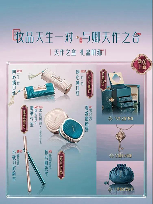 花西子把永結(jié)同心的東方式浪漫融入妝匣,為卿打造七夕定制佳禮——天作之盒。禮盒取形同心鎖妝匣,精致實(shí)用;內(nèi)置3對(duì)妝品,妝品天生一對(duì),寓意天作之合。愿卿執(zhí)此禮,得遇良人??诩t、眉筆、化妝棉雖然是常見單品,但在七夕節(jié)日氛圍內(nèi)又多了一絲浪漫意味。
