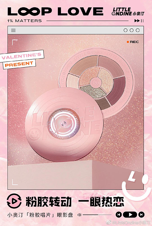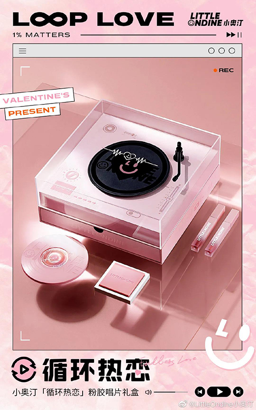 小奧汀粉膠唱片禮盒,是七夕定制版粉膠唱片設(shè)計(jì),唱片轉(zhuǎn)動(dòng),旋律播放。既是彩妝禮盒,又是音樂播放器,也非常符合年輕品牌的玩趣調(diào)性。