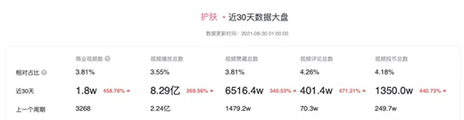 根據(jù)飛瓜近30天護(hù)膚數(shù)據(jù)顯示,截至8月30日,5大指標(biāo)均實(shí)現(xiàn)了暴漲,其中,商業(yè)視頻數(shù)達(dá)1.8W個(gè),同比上漲458.78%;視頻播放總數(shù)為8.29億次,同比上漲269.56%;視頻點(diǎn)贊總數(shù)、評論總數(shù)和投幣總數(shù),分別上漲340.53%、471.21%和440.73%。
