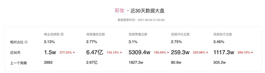 彩妝方面也實(shí)現(xiàn)了大幅增長。其中,商業(yè)視頻數(shù)為1.5w個(gè),同比上漲277.33%;視頻播放總數(shù)、視頻點(diǎn)贊總數(shù)、評論總數(shù)和投幣總數(shù),分別增長了142.12%、190.56%、220.96%和266.10%。