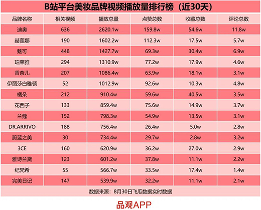 同時(shí),根據(jù)飛瓜數(shù)據(jù),品觀APP梳理近30天B站美妝品牌播放總量排行榜發(fā)現(xiàn),數(shù)個(gè)美妝品牌的單月視頻播放量超千萬。其中,迪奧相關(guān)視頻播放量為2620.1w次,位列第一,赫蓮娜和魅可緊隨其后,擠進(jìn)前三。珀萊雅、橘朵、花西子也紛紛入榜,分列第4、7、8位。