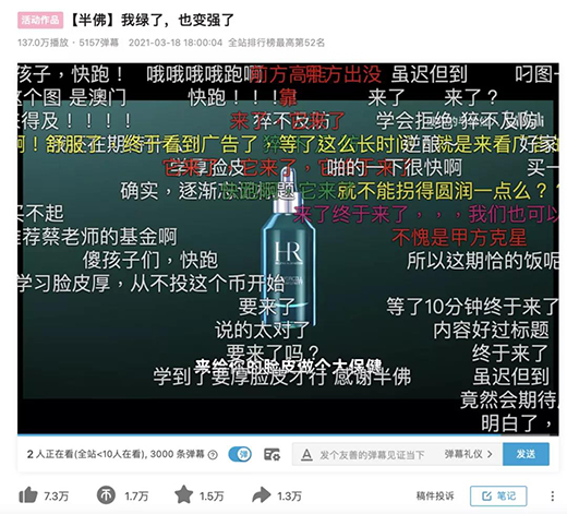 因此,很多美妝品牌在進(jìn)行品牌營銷時(shí),會更加傾向與UP主合作宣傳。典型如HR赫蓮娜,今年3月與584.7萬粉絲的UP主“硬核的半佛仙人”聯(lián)動,趕著基金熱點(diǎn),玩了回“厚臉皮哲學(xué)”,文案風(fēng)趣幽默又有共鳴感,從女性工作累切入到購買護(hù)膚品熱情高漲的現(xiàn)象,通過對社會現(xiàn)象的洞察,擊中年輕人痛點(diǎn),同時(shí)安利HR赫蓮娜產(chǎn)品,收獲了一致好評。