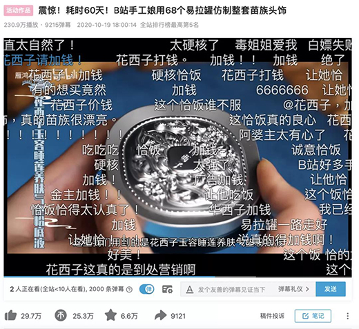 去年,花西子與手工區(qū)UP主“雁鴻Aimee”合作推出的《震驚!耗時(shí)60天!B站手工娘用68個(gè)易拉罐仿制整套苗族頭飾》火爆全網(wǎng),就是雙贏的典型案例。