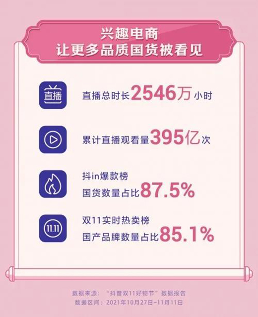 其中,抖音雙11好物節(jié)期間(10月27日-11月11日),商家自播總時長達(dá)1227萬小時,總體累計(jì)看播人次395億,品牌成交額破千萬(含破億)的品牌達(dá)577個,單場成交額破千萬(含破億)直播間282個。