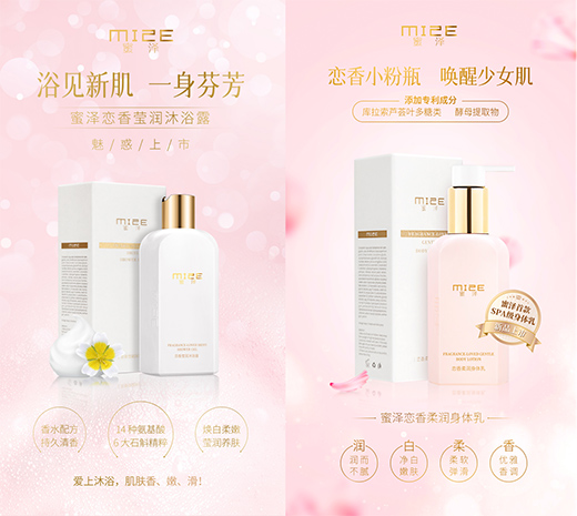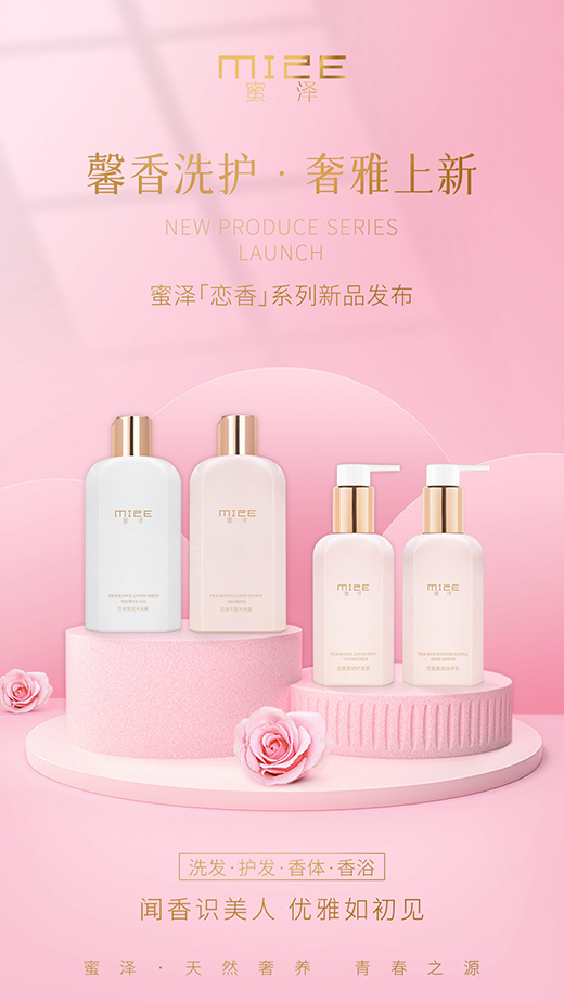本次蜜澤戀香洗護(hù)系列推出2款身體護(hù)理產(chǎn)品:戀香瑩潤(rùn)沐浴露、戀香柔潤(rùn)身體乳,和2款洗發(fā)護(hù)發(fā)產(chǎn)品:戀香豐盈洗發(fā)露和戀香柔順護(hù)發(fā)素,憑借超高“顏值”、卓效專利成分、幽香氣味和驚艷的用后感,延續(xù)蜜澤產(chǎn)品收獲一眾女性用戶喜愛。