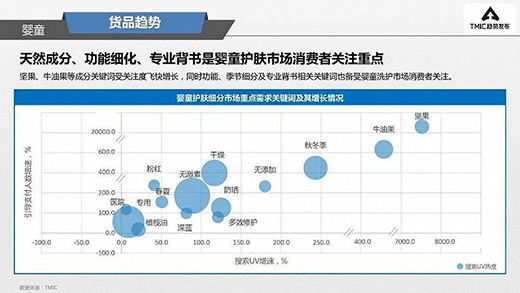 另外,數(shù)據(jù)顯示,兒童護膚產(chǎn)品中88元至123元價位段的高價值單品份額增長明顯。家長在為寶寶們挑選護膚品時,越來越關(guān)注天然滋養(yǎng),需求更加細化。