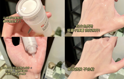 這款安瓶的瓶身設(shè)計也是別具一格,它的底部有一個白色的按鈕,輕輕按壓按鈕,就能看到白色透明狀的液體流出。不像大多數(shù)滴管式或泵頭按壓式的安瓶,容易讓安瓶暴露在空氣中,不好控制用量。不過,說實話我第一次看到舒緩呵護瑩柔安瓶的精華液,原以為它有一定的厚重感和黏膩度,結(jié)果直接涂在臉上,才會發(fā)現(xiàn)一切都是“假象”!安瓶精華能很快被吸收,瞬間能感受到積雪草提取物帶來的清爽感,太適合在這種炙熱的夏季使用了!