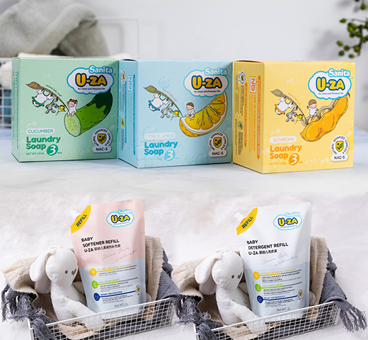 Sanita U-ZA產(chǎn)品涵蓋洗衣皂系列、洗衣液系列、柔順劑系列、奶瓶果蔬清洗系列、玩具餐具清洗等多個(gè)系列,不僅可以有效呵護(hù)寶寶肌膚,也能夠守護(hù)嬰幼兒的衣物、用品等洗護(hù)安全,從多方位解決媽媽們?cè)趯殞毘砷L(zhǎng)路上面對(duì)的各種清潔洗護(hù)難題。