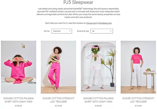品牌表示,這種睡衣能夠“鎖住水分,賦予皮膚更多的豐盈感和彈性,促進營養(yǎng)物質(zhì)的供應(yīng)和加速新陳代謝,保護你的皮膚”。目前推出的PJ5 Sleepwear,因為產(chǎn)品的前沿屬性以及新鮮感而收獲大量關(guān)注。