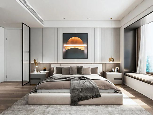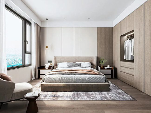 主臥的床頭背景墻貼上半墻的木飾板,搭配上灰色與奶茶色的床品,衣柜采用與整屋統(tǒng)一的白色,整體溫馨淡雅。