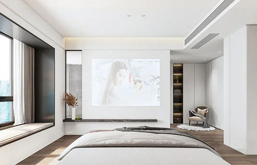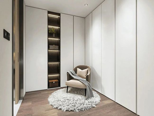 床尾是一個(gè)小型的衣帽間, 簡(jiǎn)潔的梳妝臺(tái),讓收納空間更自由,結(jié)合皮質(zhì)的梳妝椅,使空間更具時(shí)尚感,一部分留作懸掛投影布,用于日常的觀影。
