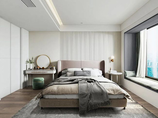 長(zhǎng)輩房與陽(yáng)臺(tái)相連,淺色的主色調(diào)讓空間沉靜,木飾面讓臥室整體增加溫馨的元素,窗戶(hù)和木質(zhì)對(duì)比鮮明,使空間富有層次感,木色地板鋪裝更協(xié)調(diào)溫度。