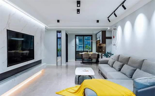 ▲無主燈設(shè)計(jì),天花板是明裝筒燈+導(dǎo)軌燈+內(nèi)嵌光源,燈光營造的氛圍感不錯(cuò)哦。白色茶幾+淺灰色沙發(fā)+淺色瓷磚,整個(gè)空間簡潔明亮,干凈大方!