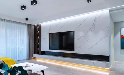 ▲白色紋理大理石電視背景墻,質(zhì)感十足。左側(cè)是定制的一排木質(zhì)收納架,可以放置書籍或藝術(shù)品。電視柜懸空,在底部留空暗藏?zé)魩В喖s時(shí)尚就是如此。