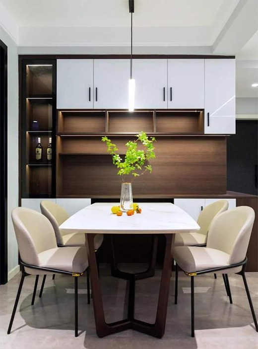 ▲一看就上檔次!實(shí)木架+石材臺面的餐桌搭配鐵藝皮坐墊餐椅,深棕色餐邊柜+酒柜+吊柜組合式設(shè)計(jì),真心好看!