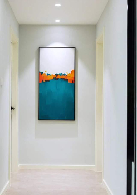 ▲天花裝上筒燈照明,深藍(lán)色+橙色搭配的抽象裝飾畫裝點(diǎn)墻面,單調(diào)的過道一下也滿滿都是藝術(shù)氣息。