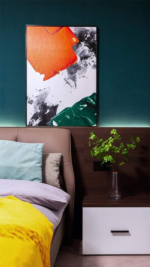 ▲床頭裝飾畫——橙色+灰白+藍(lán)色三色組成,為整個(gè)家居空間平添幾分神秘和優(yōu)雅。
