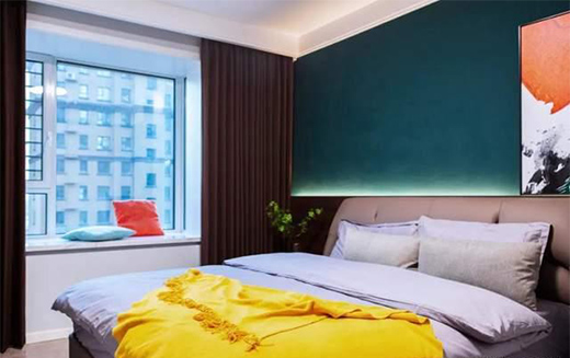 ▲臥室,這樣的色彩搭配有沒有一點(diǎn)點(diǎn)熟悉呢?深藍(lán)色床頭背景墻+橙色裝飾畫+黃色床單,搭配皮沙發(fā)+灰色床單,色彩之間的碰撞,給人以安靜沉穩(wěn)的端莊氛圍。