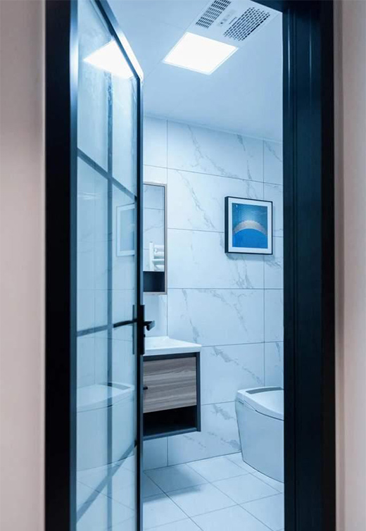 ▲最經(jīng)典的黑白配,白色墻磚地磚普通,搭配黑色邊框玻璃門+浴室柜,干凈整潔。