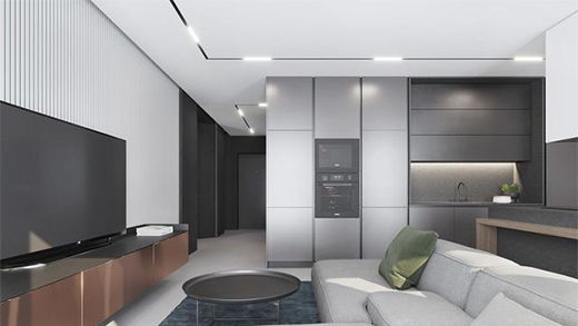 沙發(fā)區(qū)頂面射燈照亮沙發(fā)區(qū)域,客廳頂面中央的4個(gè)LED做泛光源代替主燈效果