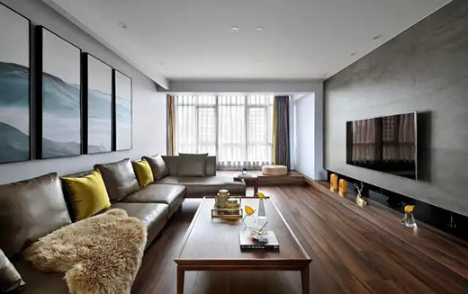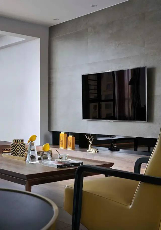 ▲電視墻是灰色的巖石板的材質,加入地臺設計與壁掛電視機,顯得極簡而小資??蛷d中間擺上一張實木茶幾,擺上精致的擺飾品,也讓空間顯得更加優(yōu)雅端莊。