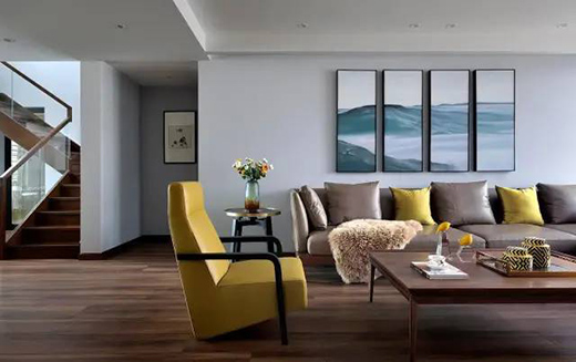 ▲實木框架+皮質坐墊的淺棕色沙發(fā),沙發(fā)墻上掛上四幅豎幅的掛畫,四幅畫拼成一幅海浪圖案,讓空間顯得更加高級統(tǒng)一而有藝術感。