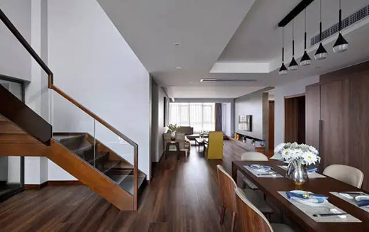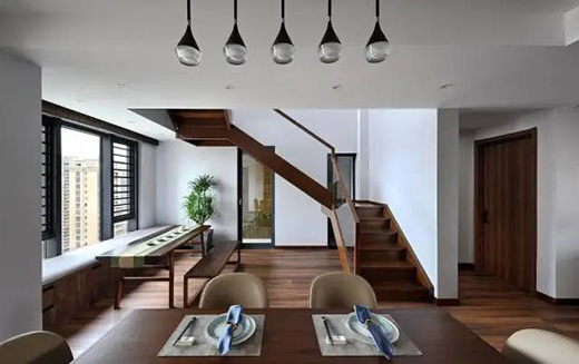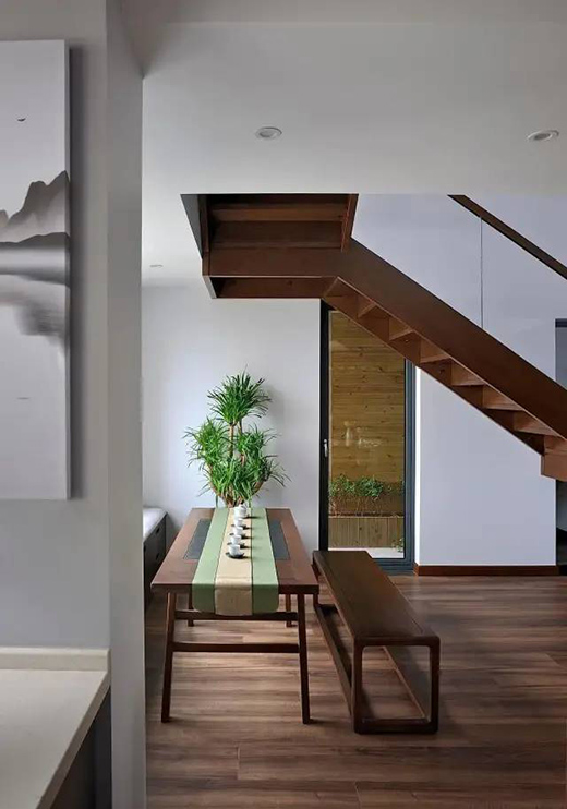 ▲餐廳設置在樓梯旁邊,整體木色的地面與樓梯,布置木質餐桌與皮藝坐墊的餐椅,也是營造出一個端莊精致的用餐空間。
