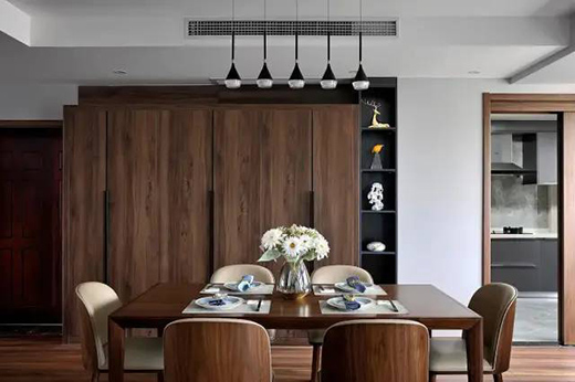 ▲餐廳旁邊的木色收納柜,加入黑色的開放展示架,擺上陶藝品的裝飾,也增添了空間的藝術與端莊感。