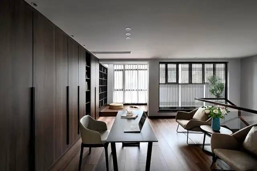 ▲書房設在二樓的樓梯后的空間,開闊的采光。布置上成品書桌與休閑椅、小茶幾,定制大面積的收納柜+書架,靠窗區(qū)域抬高的榻榻米地臺,為主人營造出了一個安靜舒適的工作與休閑區(qū)域。