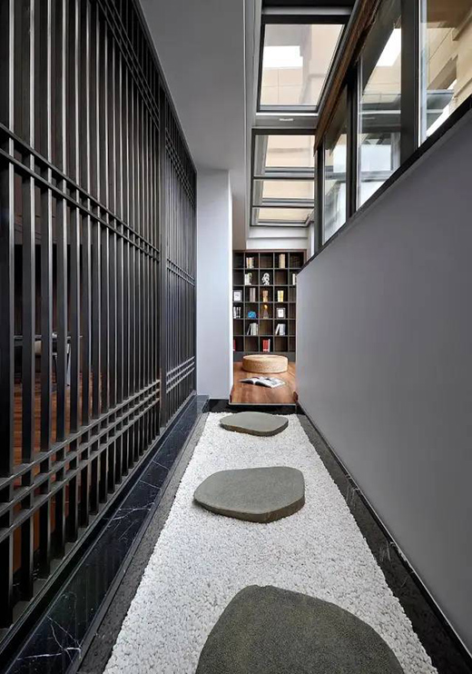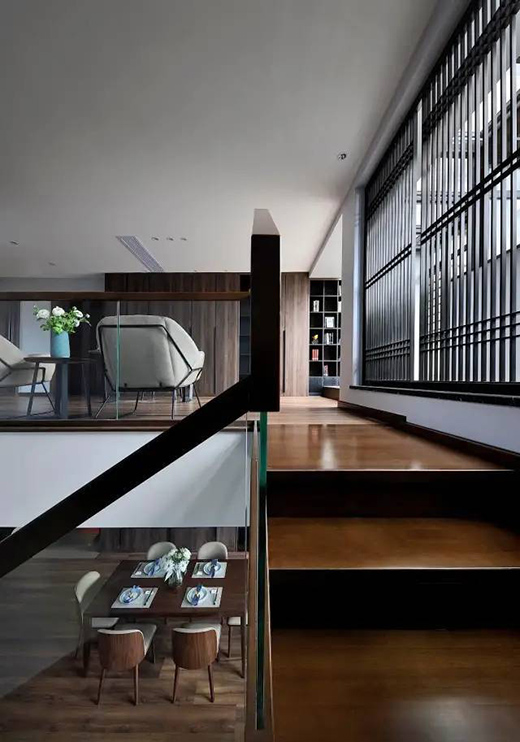 ▲書房后的樓道邊上加入一道屏風,使得空間明亮私密而又優(yōu)雅高級。