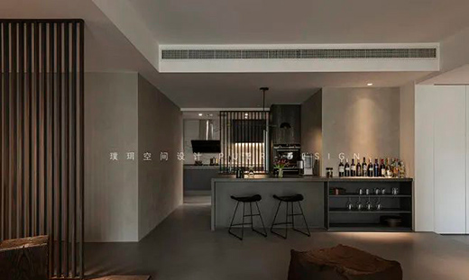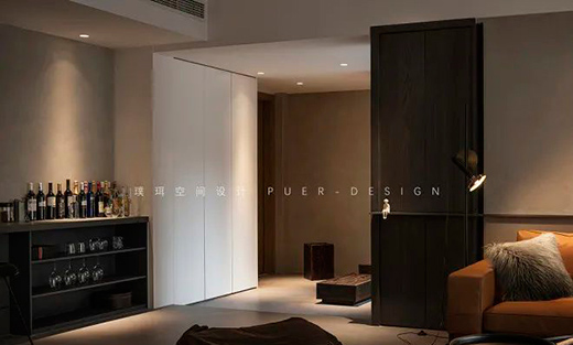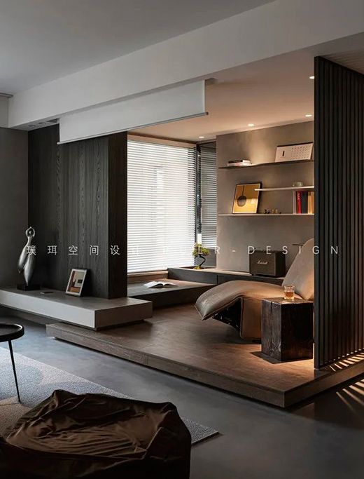 客廳功能重組,以升降投影設(shè)備釋放更開闊的靈動空間,沙發(fā)、吧臺、休閑區(qū)共同圍合出一個開放的生活場域。