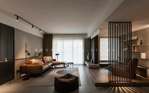 八分藏兩分露,深褐色木飾面柜體作為沙發(fā)背景墻的延伸,其實是頂天立地的書柜,細(xì)膩的紋路中和了灰調(diào)空間的硬朗,過度玄關(guān)和客廳。