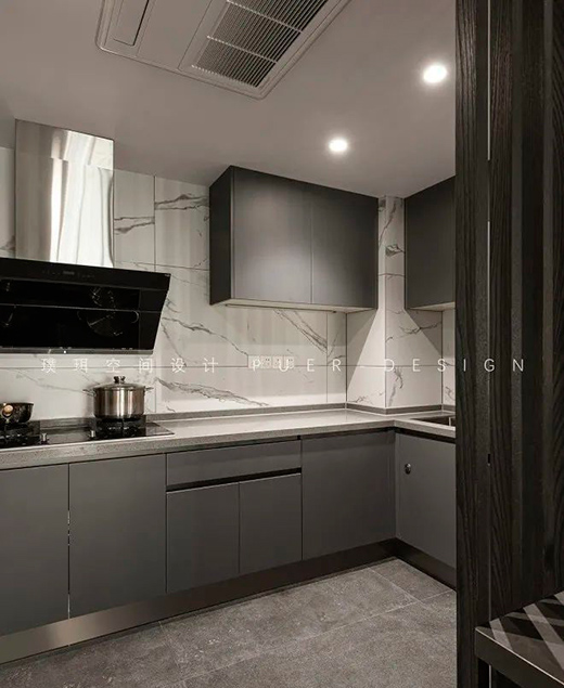 在上下都留有充足的柜體用于廚房的收納,魚肚白瓷磚拼貼,簡單大氣。