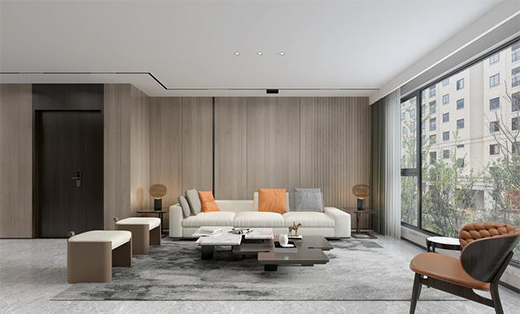 沙發(fā)背景墻全部用了原木色系護(hù)墻板,簡單裝飾黑色金屬線條,局部做凹凸槽造型。