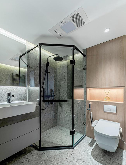 衛(wèi)生間做了干濕分離,磚石結(jié)構(gòu)式的淋浴間,里面設(shè)計(jì)了一個(gè)類似壁龕式的收納空間,這樣就不用再安裝置物架,地面選擇黑白灰斑點(diǎn)的瓷磚,然后地磚上墻的設(shè)計(jì),讓整體空間充滿北歐風(fēng)情。全屋素雅簡練,充滿很強(qiáng)烈的高級感。